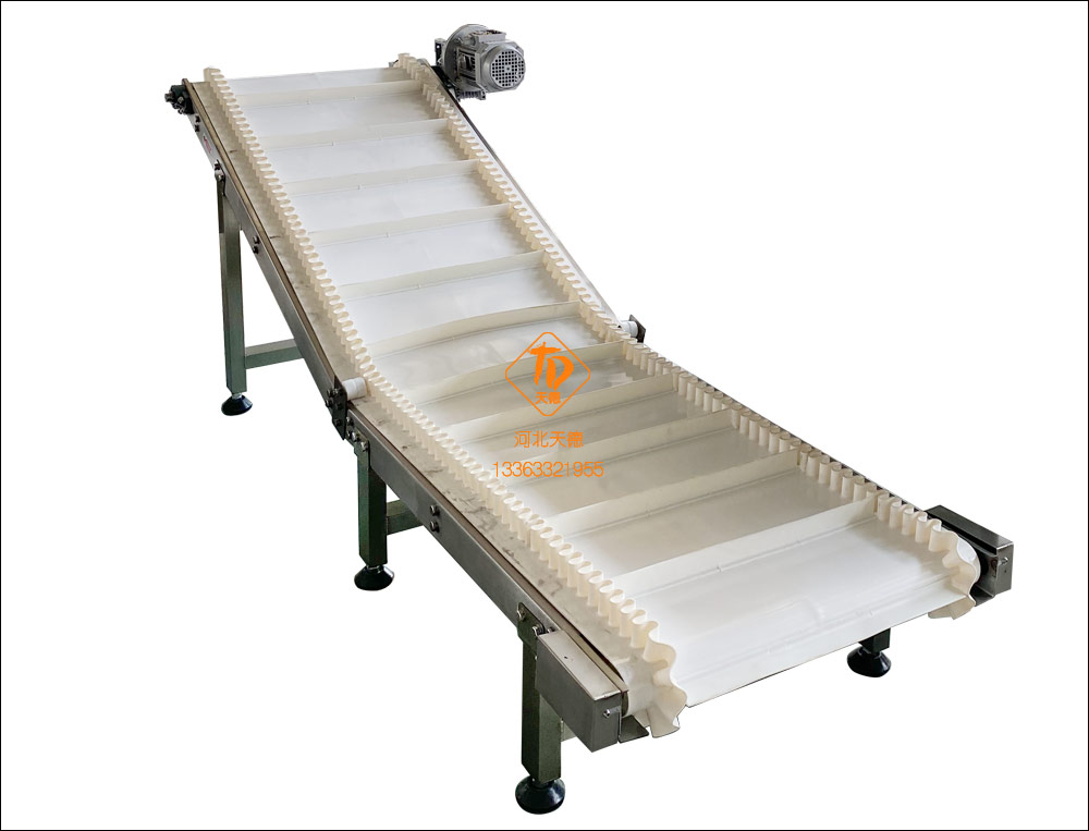 波形擋邊輸送機又叫大傾角皮帶輸送機,其結構是在平面皮帶兩側粘接可伸縮的橡膠波形立式“裙邊”,在裙邊之間又粘接有一定強度和彈性的橫隔板組成匣形斗,使物料在斗中進行連續輸送。 波形擋邊大傾角皮帶式輸送機:可廣泛用于煤炭、糧食、建材、化工、水電和冶金等部門,工作環境溫度為-19℃~+40℃范圍內,一般輸送體積小重量輕的各種散狀物料。