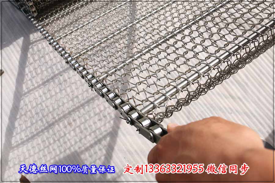天德溫馨提示: 不銹鋼輸送帶屬于非標準件,我們將根據你提供的規格長寬,材質,不銹鋼絲線徑,編制結構尺寸,支軸直徑,支軸間距,鏈條型號等數據制作。