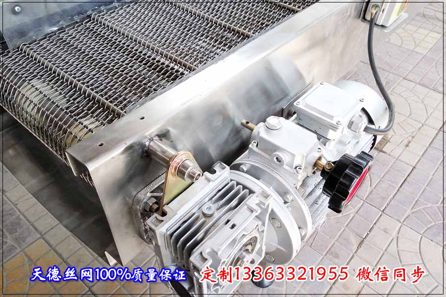 網帶輸送機總長5米,輸送機總高度為70公分,輸送機的總寬度為600毫米。整機采用不銹鋼304材質,輸送部分采用鋼絲編織型金屬輸送帶,輸送帶總長為10米,總寬度為500毫米,鋼絲編織的孔徑為5*15毫米,穿桿直徑為8毫米,鏈節距為38.1毫米,桿與桿之間的距離為150毫米左右。特別要求電機外要采用防雨罩罩起來,網帶輸送機上面要安裝排風扇,排風扇離著金屬輸送帶要有30公分的距離,整機采用活動腳安裝,方便挪動。整條輸送機下面安裝一個托盤,托盤可移動,用來接住瀝出來的油。
