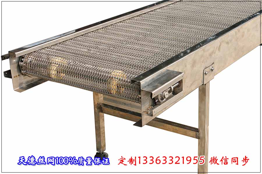下面是此網帶輸送機的詳細數據: 網帶輸送機的凈寬度為600mm(輸送帶的使用面積),輸送機平面的尺寸為1824mm(其余的作為提升),提升的高度為1200mm,總長度為3995mm。機身板厚4.5mm材質為碳鋼,所有底腿加橫支撐,鏈輪與傳動軸、軸承座全部為碳鋼。電機使用皮帶輪電機功率為1.5kw,減速機速比1:80, 配帶變頻器。 網帶輸送機使用的鏈條節距為50.8mm,不銹鋼絲直徑為2mm,網孔為10mm*15mm(凈孔),不銹鋼輸送帶桿直徑10mm,間距101.6mm(兩節鏈條一根 ),材質為耐腐蝕304不銹鋼。 以上是客戶訂購的詳細數據,在這里希望我的分享能給大家帶來幫助。