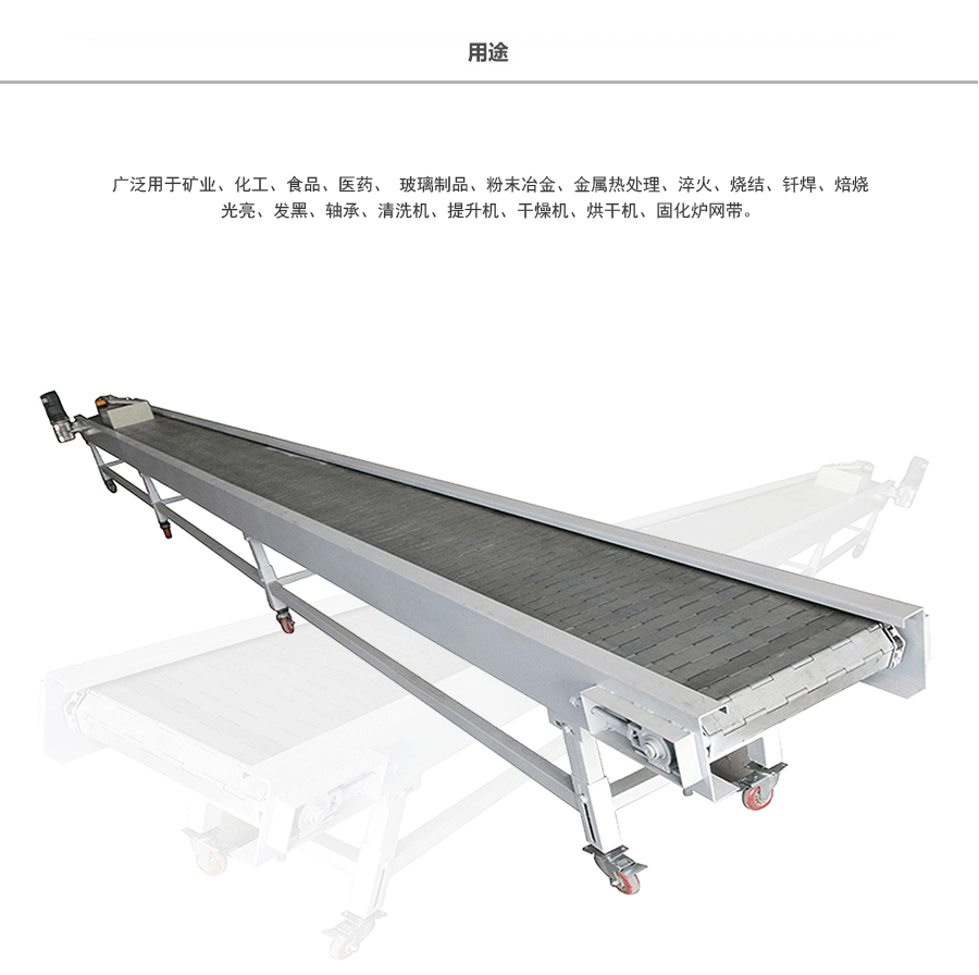鏈板輸送帶應用:鏈板式網帶廣泛用于玻璃制品行業的退火爐鏈板、烤花爐鏈板等。食品加工行業、脫水蔬菜、速凍食品單凍機前處理鏈板、鏈網。粉末冶金、金屬熱處理、淬火、燒結、釬焊、焙燒、光亮、發黑、軸承、滲碳高溫爐鏈板、擋板式鏈板、涂裝烘干線輸送鏈板、泡沫鎳還原生產線鏈板,清洗機、提升機、干燥機、烘干機、固化爐鏈板。各輸送工藝鏈網、鏈板、速凍、烘烤機械的平面輸送、螺旋輸送、食品機械的清洗,烘干、降溫、蒸煮等玻璃機械的退火、烤花、輸瓶等。