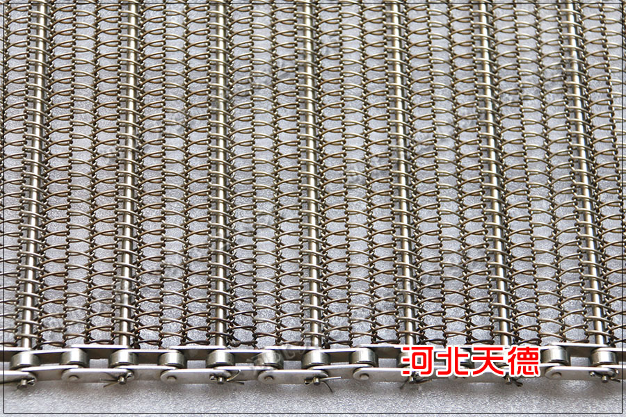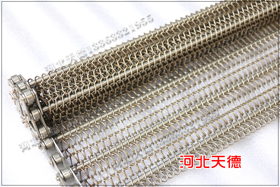 鏈條節距為38.1毫米,鏈桿直徑為8毫米,每米載重大概在10公分,烘干的食品大小大約為10*20毫米,河北天德廠家為其設計的鋼絲直徑為1.5毫米,孔大小為5*10毫米。