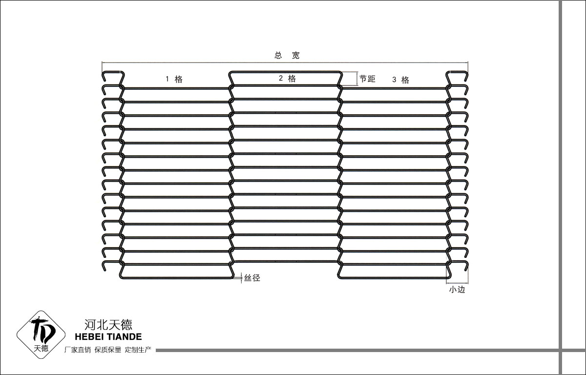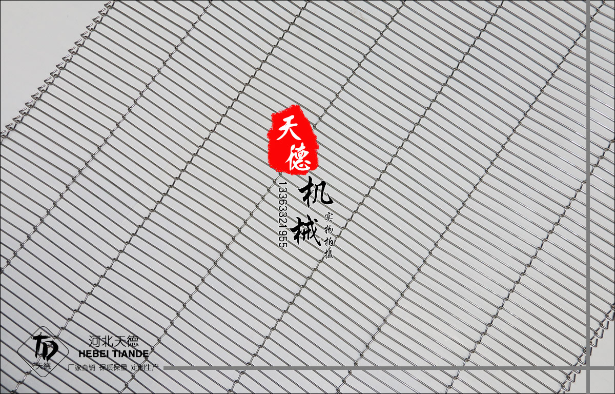 乙字網帶使用不銹鋼高彈柔韌絲制作。網帶多用單小邊結構(常用),雙小邊結構用于特殊用途。可以用于直線輸送機,也可以用于轉彎輸送機。