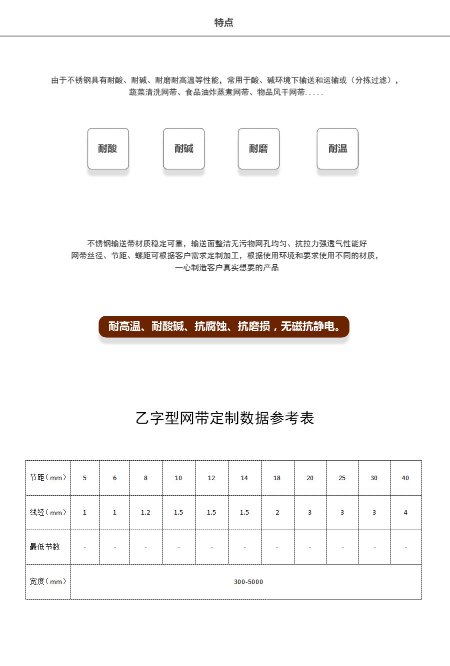 乙字型網帶特點:其組織結構形狀有普通編織、加固編織、分段式普通編織等。