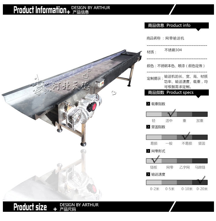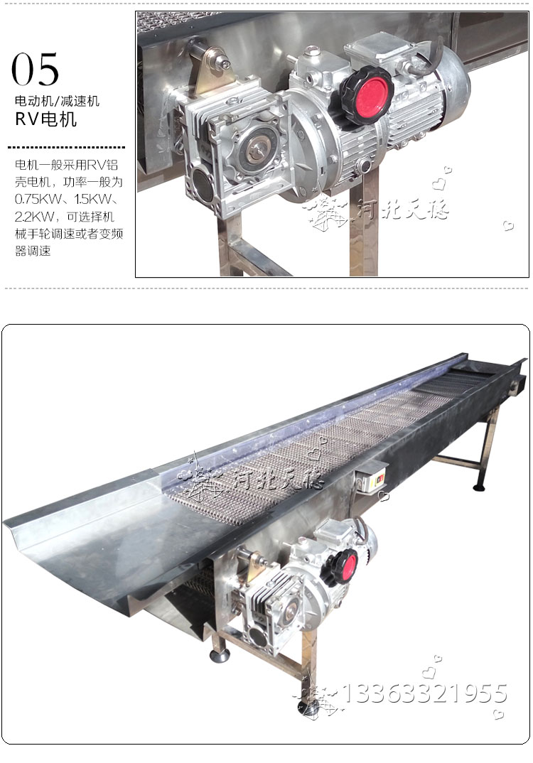 設(shè)備特點(diǎn): 網(wǎng)帶輸送機(jī)以不銹鋼網(wǎng)帶作牽引件輸送物料,運(yùn)行平穩(wěn)、造型美觀、使用壽命長(zhǎng)。