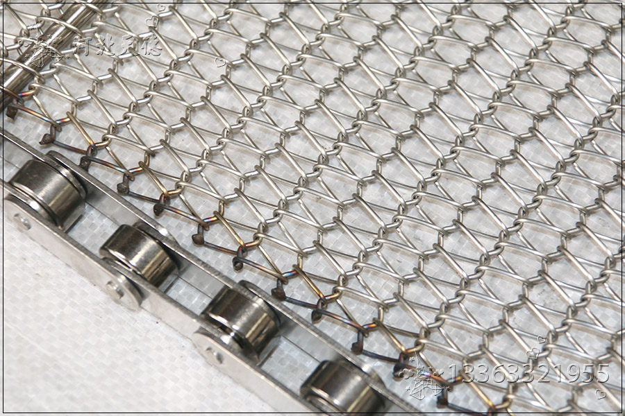 網帶都采用軋牙串條、左右網條二根串,并大小網條連接而成,大網條內穿進小軸,小軸二端穿入鏈條孔,從而達到鏈條驅動輸送網帶。